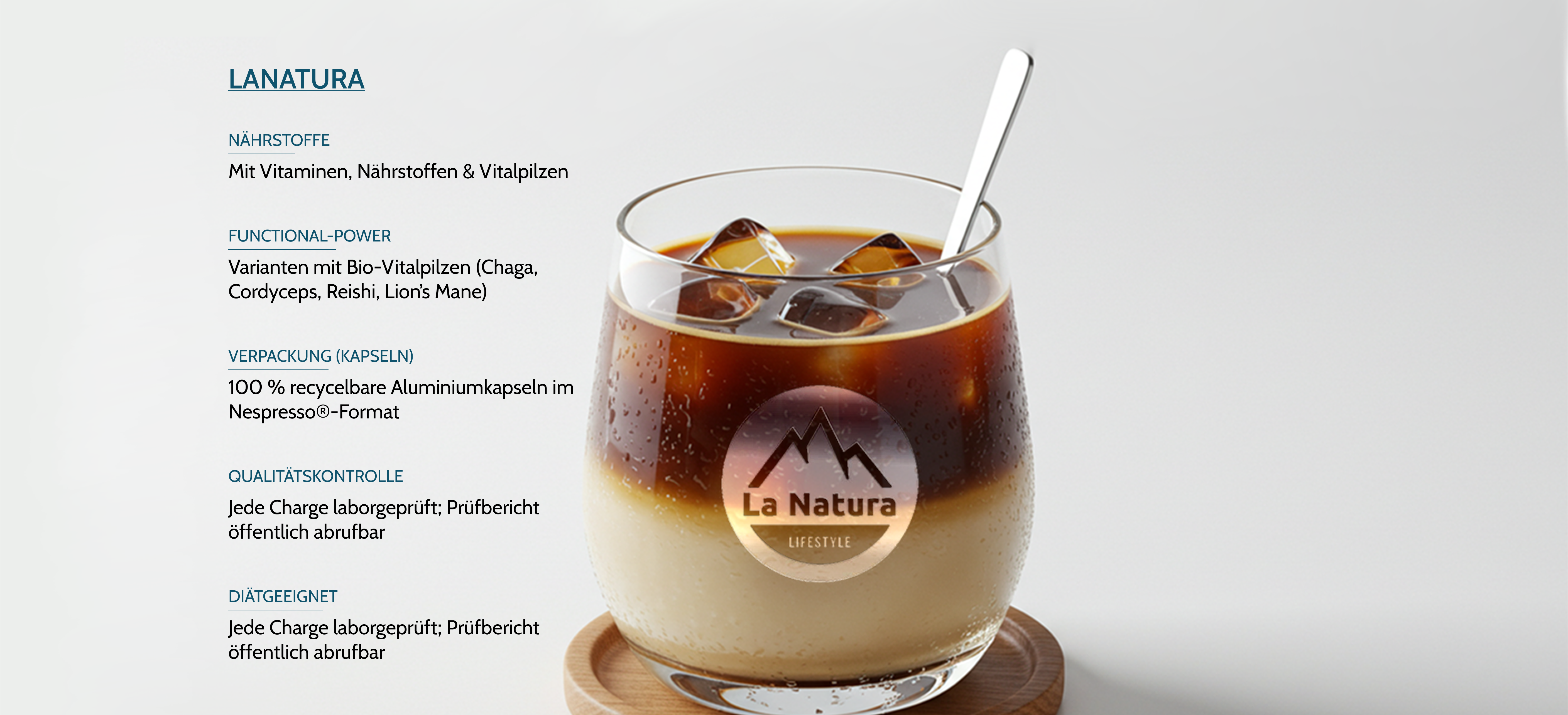 LaNatura wird in der Schweiz besonders schonend geröstet, ist magenfreundlich und enthält zusätzlich adaptogene Pflanzen-Extrakte, Vitamine und Mineralstoffe. So bekommst du volles Aroma plus funktionellen Mehrwert – ohne Pillen oder Pulver.