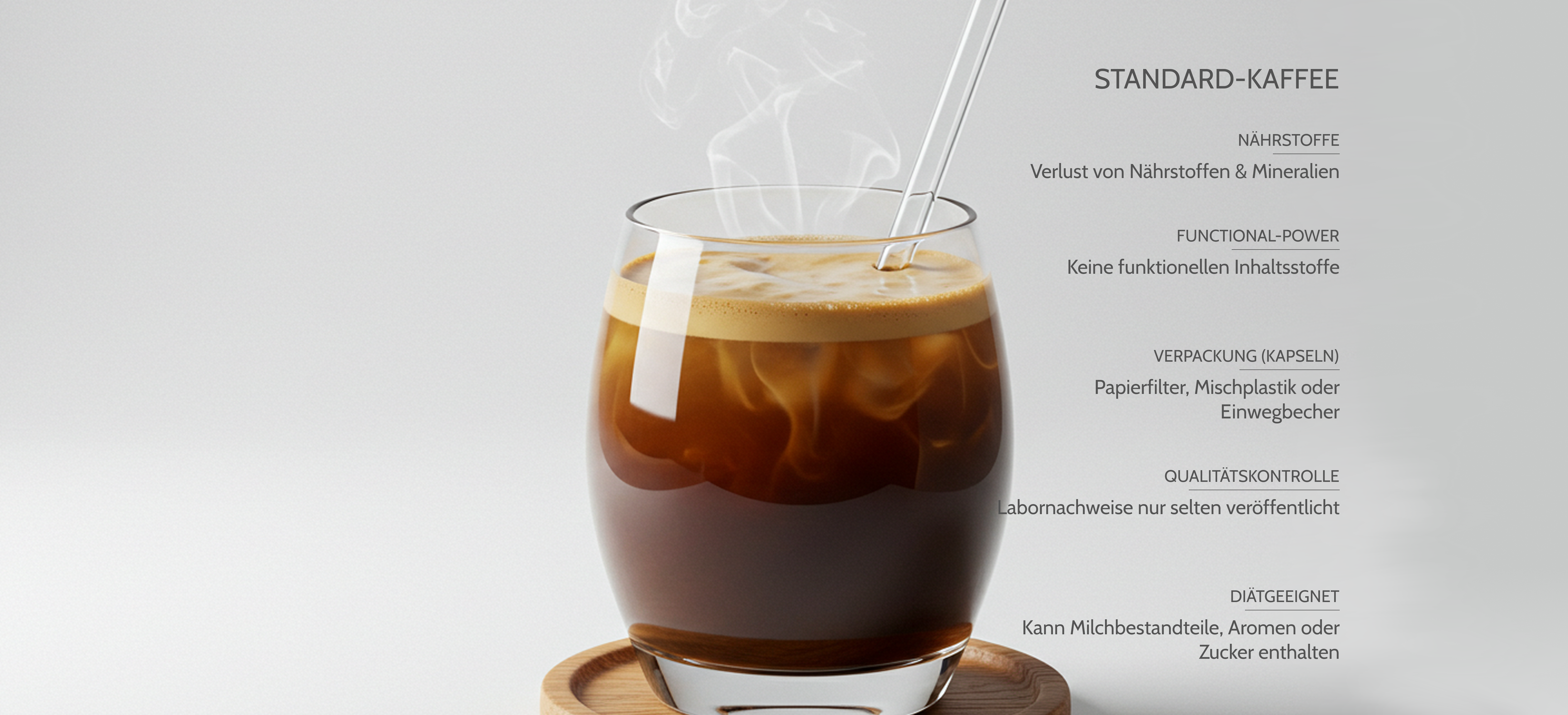 Normaler Kaffee macht wach, entzieht dem Körper aber wertvolle Vitamine und Mineralien, reizt den Magen und pusht Cortisol.